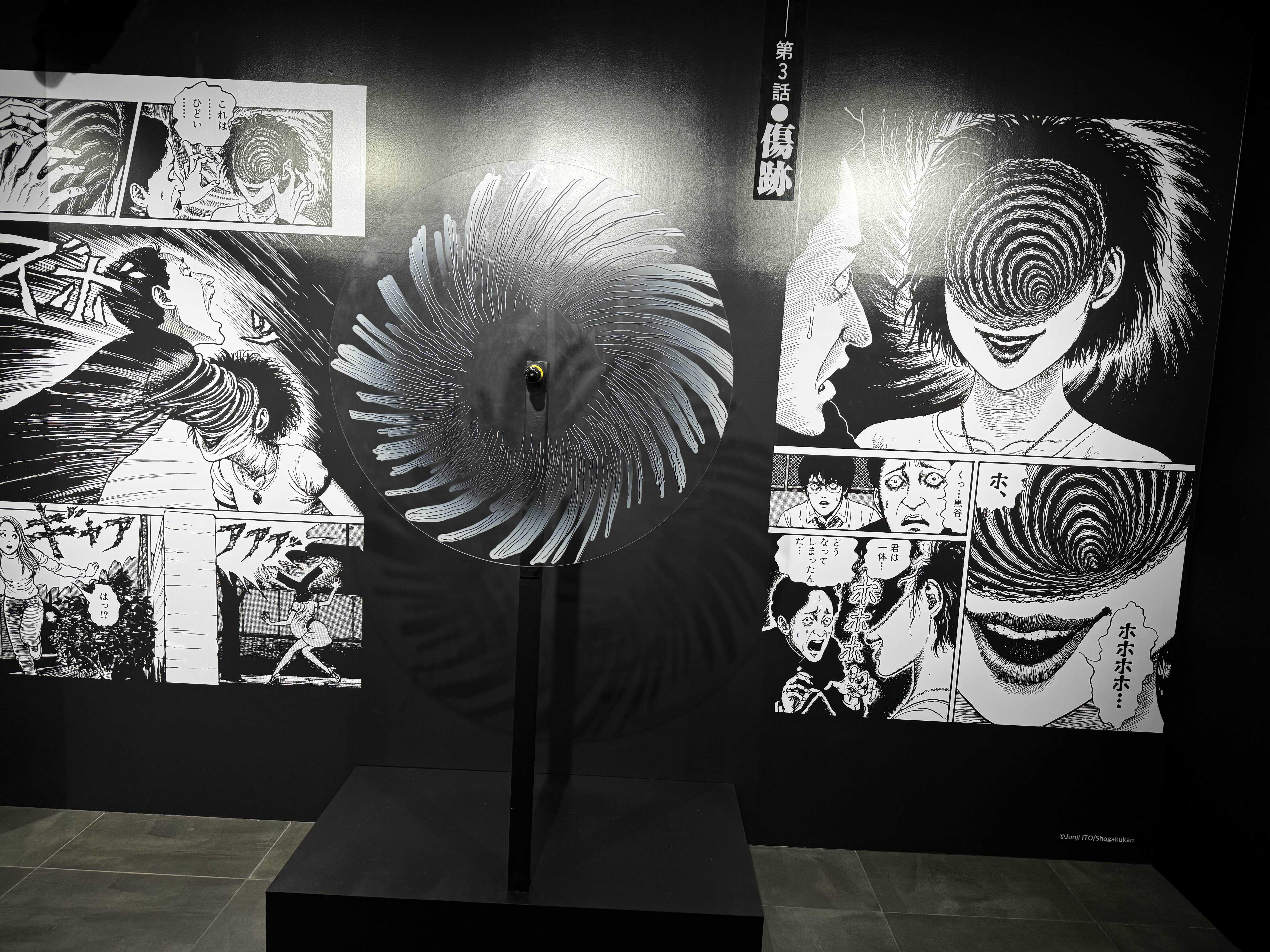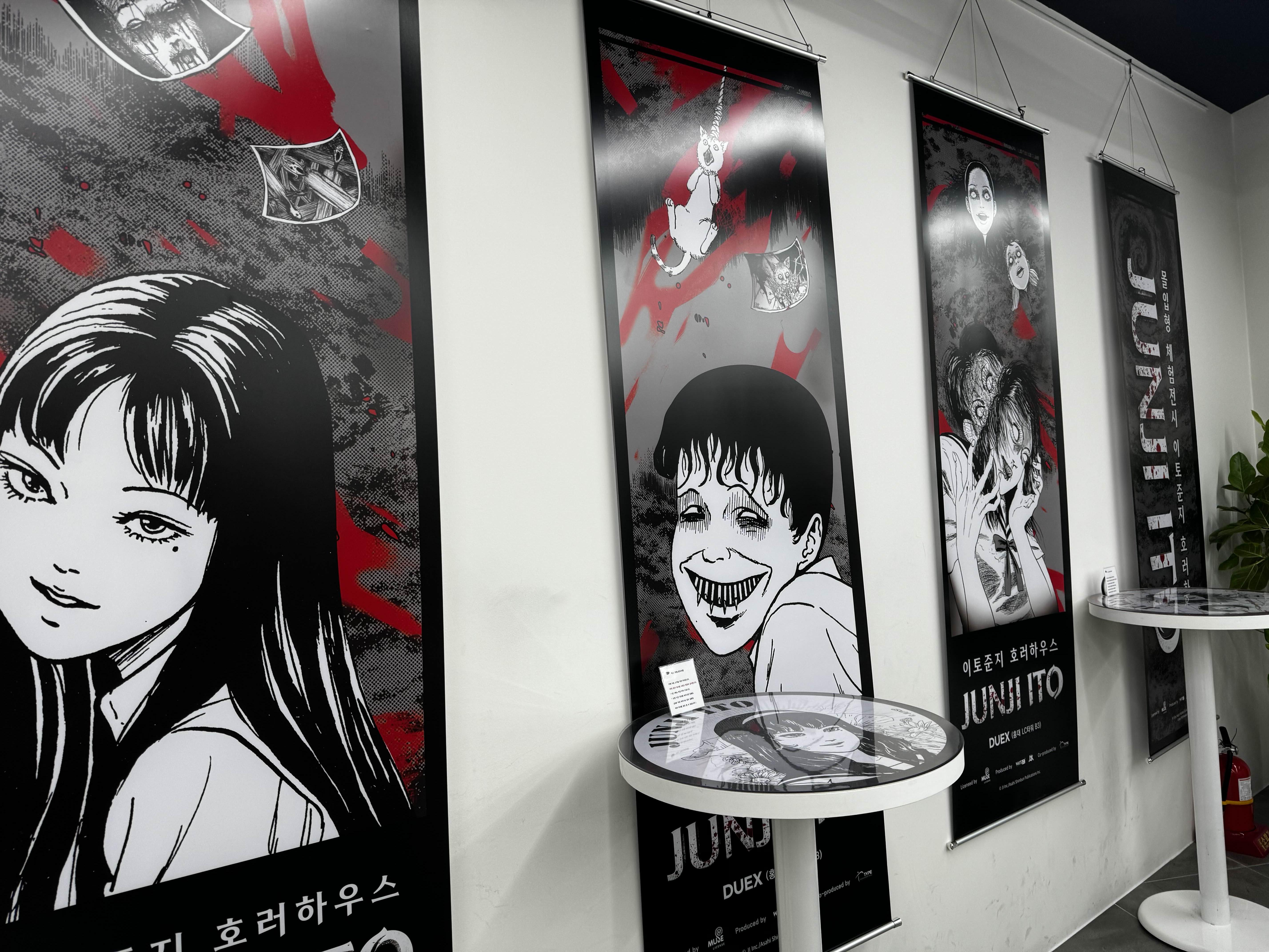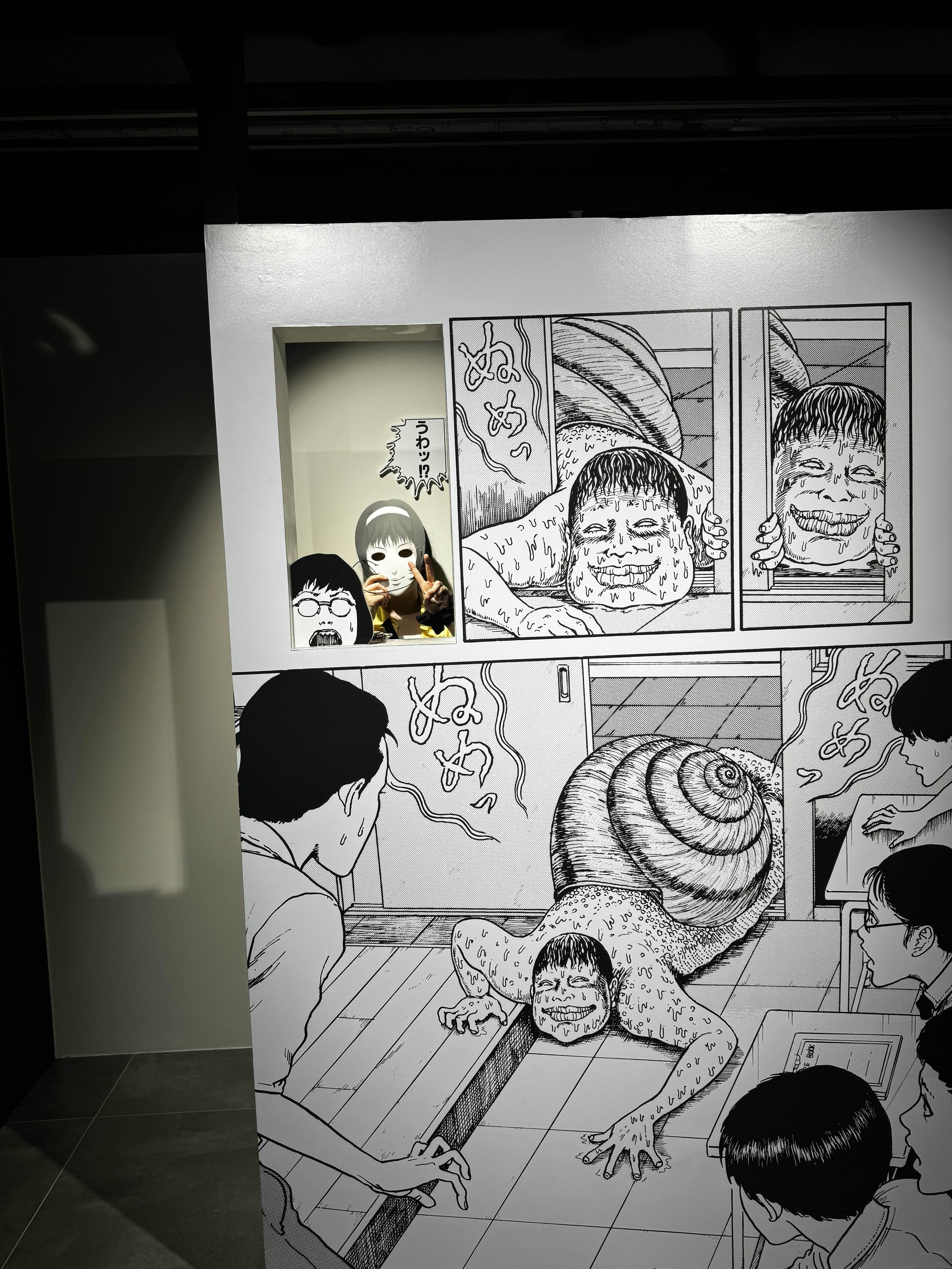 10~15분 정도 그런 긴장감 넘치는 공포 체험이 끝나고 나면, 드디어 진짜 전시회가 시작돼요. 이토 준지의 대표작 장면들이 전시된 곳에서 사진을 찍을 수 있는 포토존도 있었어요.