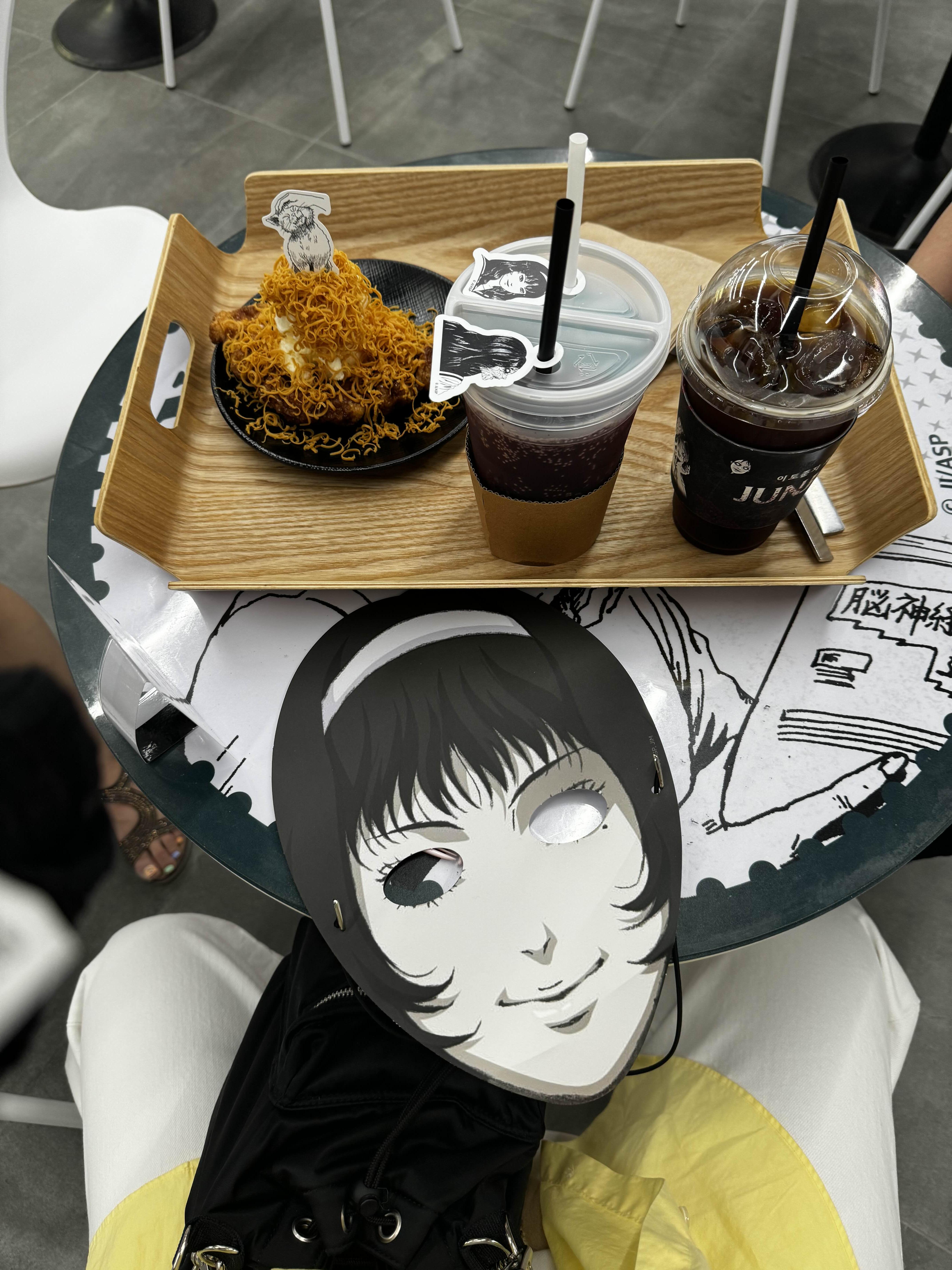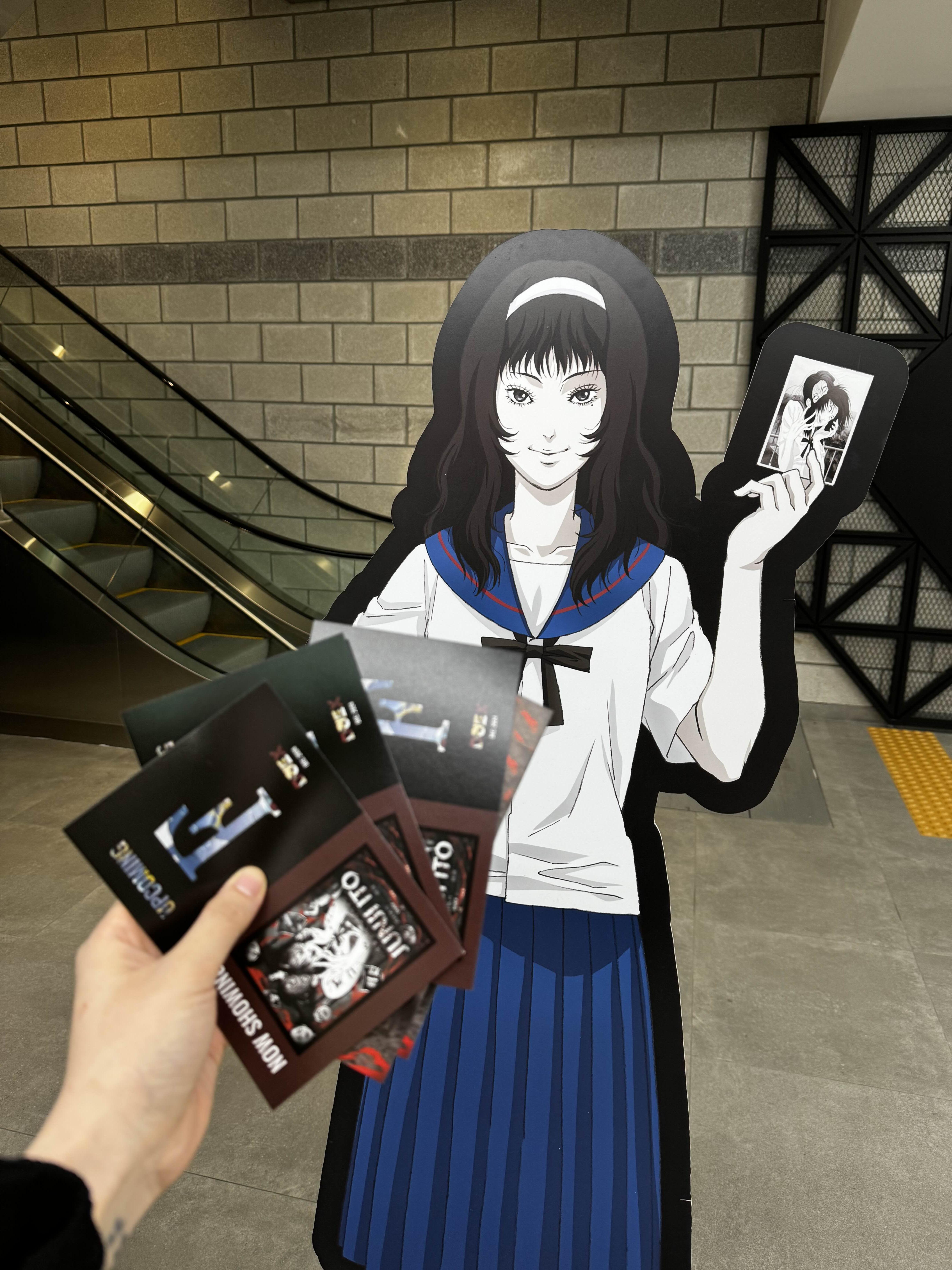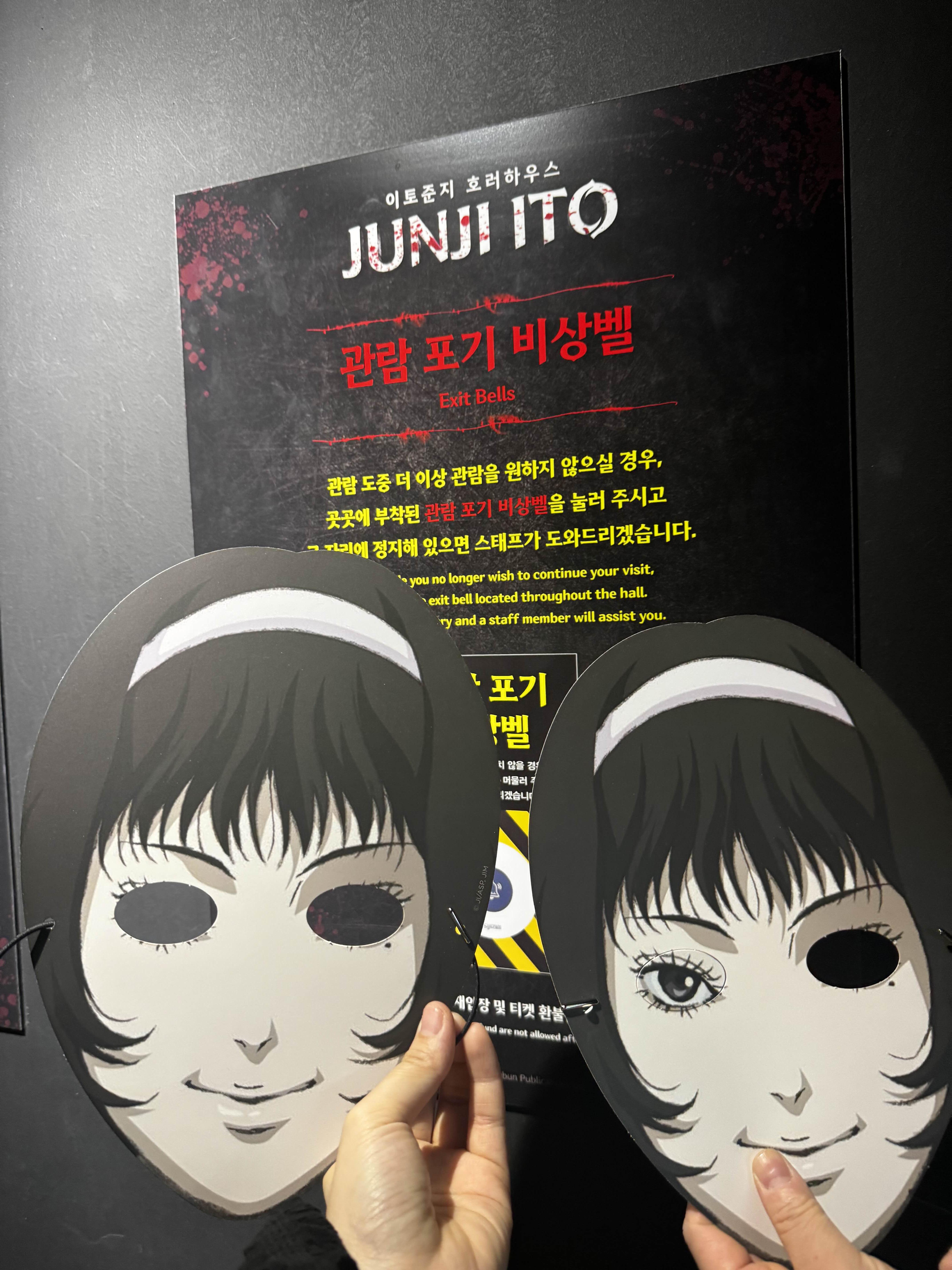 전시장의 문이 열리고 나서, 우리는 한 줄로 서서 밧줄을 잡고 들어갔어요. 앞쪽과 맨 뒤쪽은 제일 무섭다고 하던데, 다행히 저는 끝에서 두 번째 자리를 맡았어요. 들어서자마자 이토 준지의 만화 속 캐릭터들과 장면들이 생생하게 구현되어 있어 정말 소름이 돋았어요. 게다가 그 만화 속 귀신들이 갑자기 나타나는데, 분장도 너무 리얼하고 소리도 무서워서 순간 귀와 눈을 다 막아야 했답니다. 저 혼자만 소리 지르다가 민망해지기도 했어요. 제 팀원들은 강심장이었던 모양이에요.