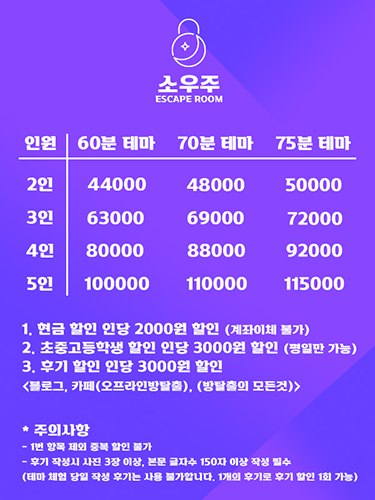 추리에 진심인 사람들에게 추천드리고 싶은 테마입니다. 어려운 난이도에 도전해보고 싶은 분들께는 별 4개짜리 이 테마가 제격일 거예요! 소우주 방탈출, 다음에는 어떤 테마에 도전할지 벌써부터 기대가 됩니다.