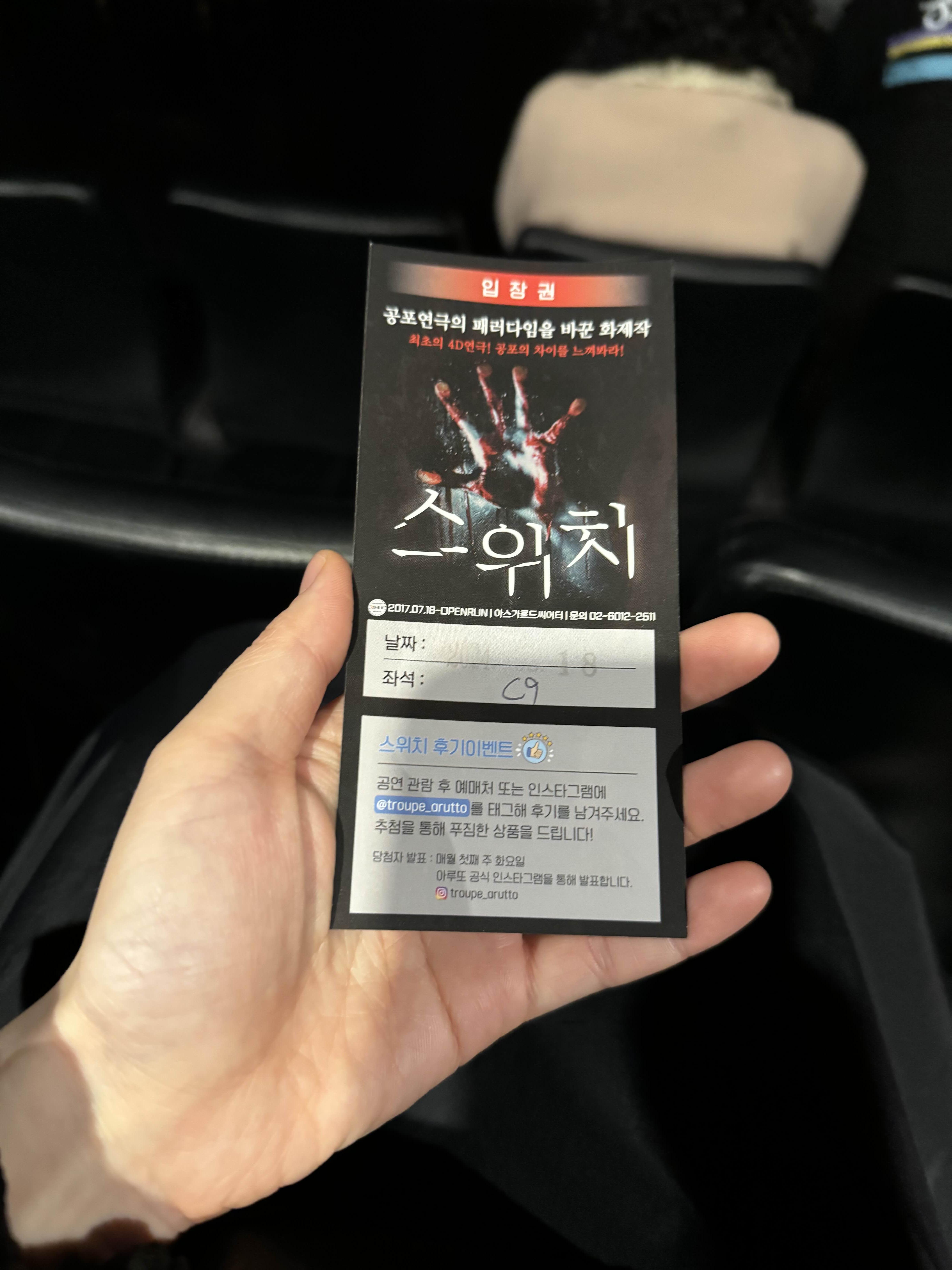 안녕하세요! 지난 주말, 친구 두 명과 함께 아스가르드 씨어터에서 열린 공포 연극 ‘스위치’를 보러 갔어요. 평소에 무서운 걸 잘 못 참는 저라서, 극장에 들어가기 전부터 이미 심장이 쿵쾅거렸답니다. 그래도 ‘스위치’가 워낙 화제라서, 어떻게든 도전해보고 싶었어요.