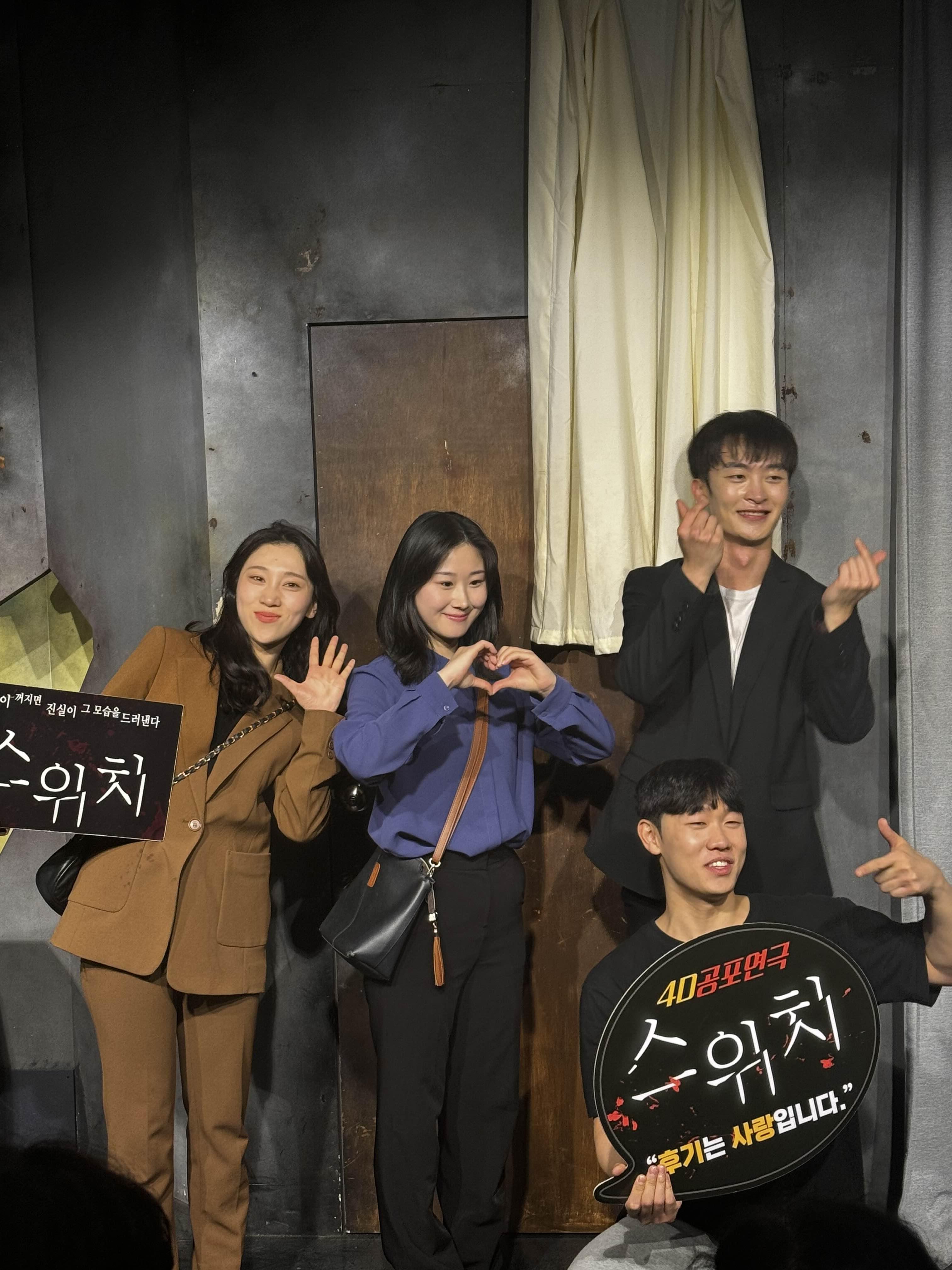 연극이 시작되자마자, 배우들의 열정적인 연기가 무대를 채우면서 관객들도 함께 몰입하게 되더군요. 초반에는 웃음을 자아내는 장면도 많아서 살짝 긴장이 풀리는가 싶었지만, 그건 정말 잠시였어요. 갑자기 무대가 암전되면서 분위기가 확 바뀌더라고요. 불이 꺼지고 어둠이 깔리면서 극의 제목처럼 ‘스위치’가 켜지듯, 무서움이 시작됐어요!