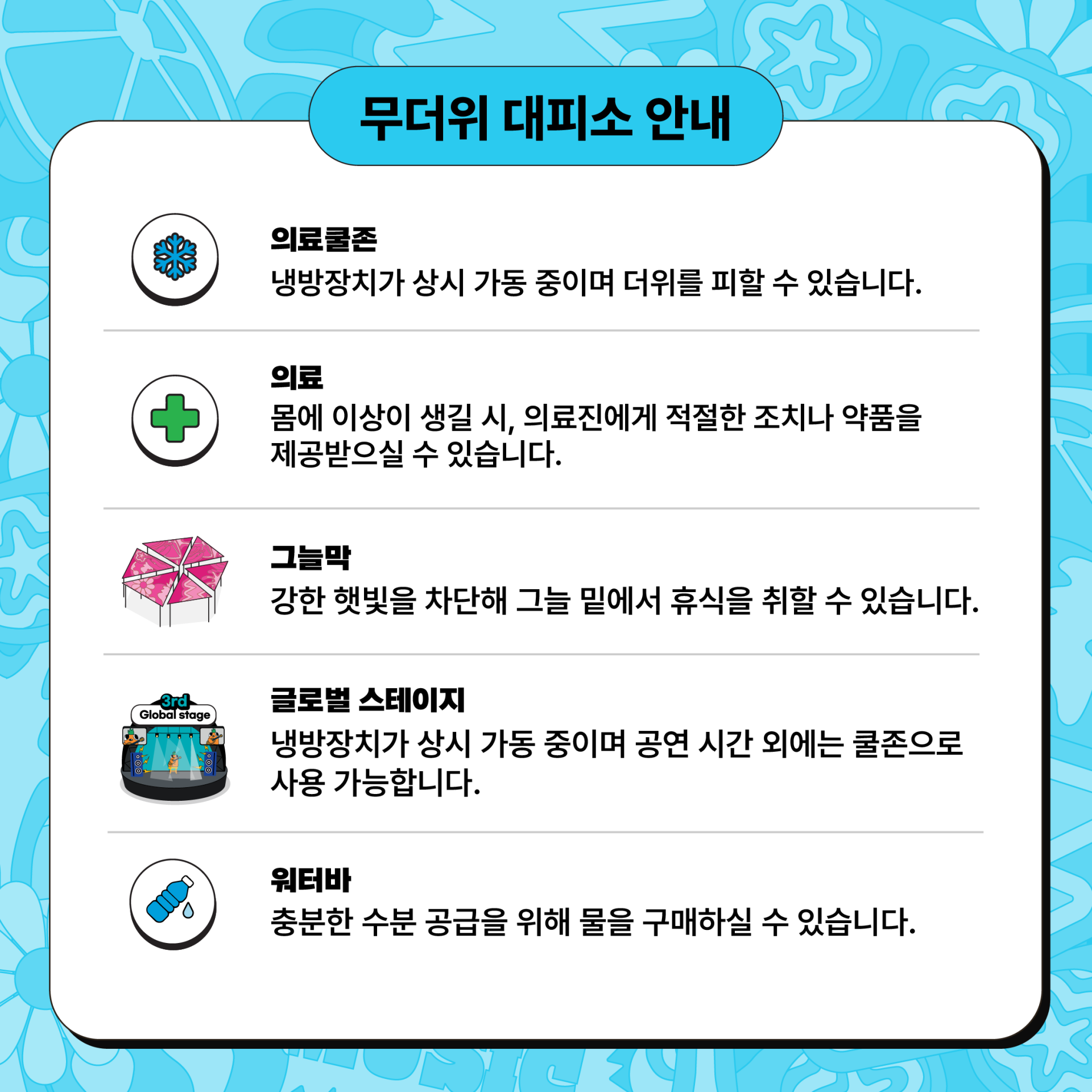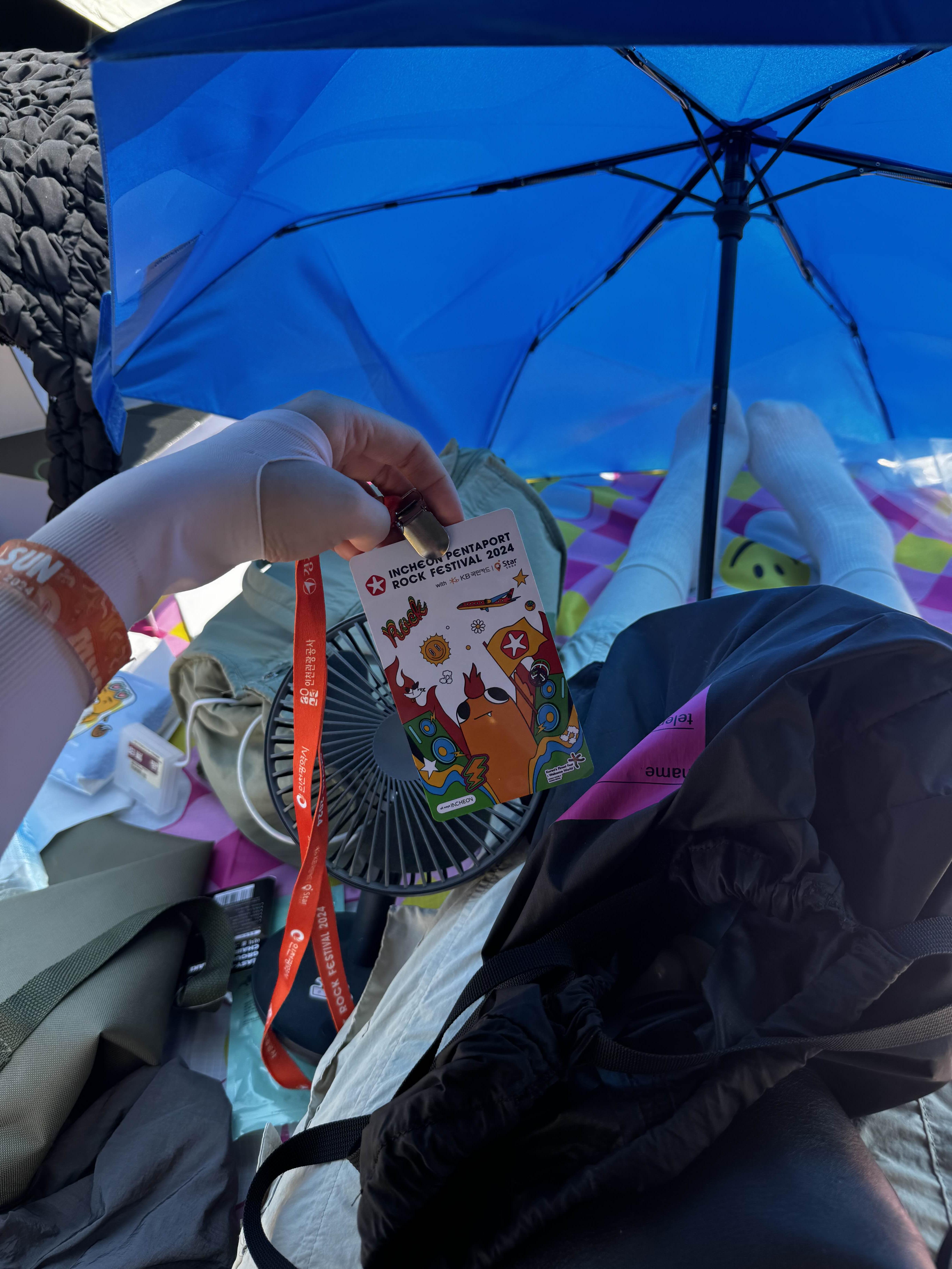 이 페스티벌은 더위와의 싸움으로도 유명하죠. 그래서 저도 만반의 준비를 하고 갔어요. 쿨토시, 챙이 큰 모자, 손풍기, 양산, 선글라스, 그리고 절대 빠질 수 없는 썬크림과 얼린 생수까지 챙겼어요. 그리고 피크닉존에서 편하게 공연을 즐기기 위해 돗자리, 미니 테이블, 보냉백, 약간 큰 선풍기까지 완벽하게 준비했습니다. 근데, 짐 검사도 꽤 까다로워서 필수템 외에는 최대한 안 가져가는 걸 추천드려요.